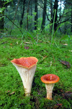 モミの樹下によく出るきのこで、大きくなると高さ15センチにもなることがあるが、成長するとこの鮮やかな赤は色あせてしまう。雨が降ると当然中に溜まってしまうが、そういう目的のための形なのだろうか?