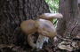 なにを思ったのか、全幅の信頼を寄せていた我が竹ベンツのカーナビが、ずい分遠回りの道を選んでしまったために、同乗のK氏ともども集合時間に遅れてしまった。が、遅れても参加はできるので問題はない。 また少し汗ばむような気温になって、相変わらずきのこは少ない。木の根際に束生している大きなきのこがあって、カサや中空の柄の感じからクサウラベニタケと思ったが、撮影しながら良く見ると1個のカサに爪で押したような紋が見えた。ウラベニホテイシメジだった。「名人泣かせ」とはよく言ったもので、この日の鑑定会でも両種がたくさん採取され、分けられた後でも1本混じっていた。 草むらの中に姿のいい大型ヒトヨタケ科を見つけた。ミヤマザラミノヒトヨタケだ。カサの条線がとても美しいが、鑑定へ持ち込む頃にはもう真っ黒になっていた。 斜面に白いテングタケ科きのこを見つけた。どうせドクツルタケの仲間かと見るとカサの周囲にツボの破片が垂れ下がっている。最近、新種発表されたコトヒラシロテングタケだ。シロテングタケのようにカサに残ったツボの破片が黄色くはならない。 そのすぐ近くでシロソウメンタケ科のようなオレンジ色のきのこを発見。撮影後に採取して鑑定へ持ち込むと、なんと冬虫夏草のサナギタケだった。この仲間のきのこに興味が薄いため、うかつにも地上の子実体だけを採ってしまった。すぐに引き返して掘り出すと、菌糸に包まれた大きな虫が出てきた。図鑑によるとガ類のサナギから発生となっているが、宿主を良く見ると長さ5センチほどもある幼虫だった。サナギタケの近縁種という可能性もあるとのことだった。 ※後日、サナギタケではなく、たいへん珍しいベニイモムシタケの可能性が高いと教えていただいた。そうなら発見例が少なく貴重だとのこと。 【お知らせ】10月8日(火)の読売新聞夕刊に「IT関連」のコーナーがあり、「きのこ」の特集が組まれるらしい。当HP「ドキッときのこ」も掲載される予定なので、ぜひ、ご一読を・・・。 |