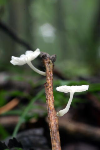 カサの直径10ミリくらいの小さなきのこ。あちこちの落ち枝にいっぱい生えていた。柄のもっとも下の部分がわずかに黒い。