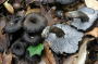 地元の探索ポイントとしては「高麗山」についで、期待の持てる面白い場所がここ「びわの森」だ。今までにも色いろいい写真を撮ることができている。 事務所へあいさつの後、探索を開始。すぐに落ち葉の多い斜面で、黒いカサの群生を見つけた。採取して見ると裏は明るい灰色でシワ状の脈が密に走っている。アクイロウスタケだが、昨日のものよりはるかに大きく広い範囲に群生している。図鑑によれば「ややまれ」なきのこらしいが、突発的に多く発生するのだろうか。 その同じ斜面に枯葉に埋もれた黄色いきのこを見つけた。慎重に葉を除くと3本並んでいた。傷んだ所が黒く変色しているので 苔の間からいくつもツチグリが顔を出していた。古くなって泥まみれになったのも多かったが、新鮮なときの銀色の輝きはいつ見ても美しい。 枯葉が多くなるときのこ探しは困難になるが、この色は見つけやすい。まだ幼菌だが明るい紫色が目に飛び込んできた。ムラサキシメジだ。根元が大きく膨らんでカサが強く巻き込んでいる。 最後にまた、アカヤマタケを見つけたと思って枯葉をはらいながら良く見ると、どこにも黒変しているところがない。おなじヌメリガサ科でもこれは種類が違う。カサに粘性がなく柄にも繊維状の筋が見られない。となるとベニヤマタケということになりそうだが、こんなに黄色いタイプもあっていいのだろうか。 気温が下がっていよいよ冬に突入のようだが、まだまだ面白いきのこは見られそうだ。 |