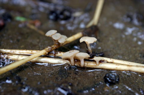 今まで見つけたものはすべて落ち枝に生えていたが、今日見つかったいくつかはササの茎に出ている。正確には検鏡しないと分からないが、これも柄に毛が生えているミズタマタケなのだろう。