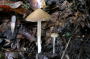 昨夜、何気なくいろんな「きのこ関連HP」を眺めていて、高橋春樹さんの「八重山諸島のきのこ」の新種が紹介されているページに行き当たった。興味深く見ていて「コガネハナガサ」という美しいきのこを見た瞬間、以前撮影して不明のままにしているものにそっくりだと思った。 時期がうろ覚えだったので1年分くらいを探してみると、あった!2002年6月16日に地元平塚市の「びわ青少年の家」で撮影した中で、「不明」と名づけてそのまま調べていないきのこだった。 キツネノハナガサにちょっと似ているが、黄色ではなくオレンジ色の微粉をつけているような感じで、根元にはまるでゴマ粒のような幼菌が密生している。 キシメジ科クヌギタケ属でありながら、成菌は一夜で萎れるらしい。再度見つけてぜひ標本を手に入れたいきのこだ。 |