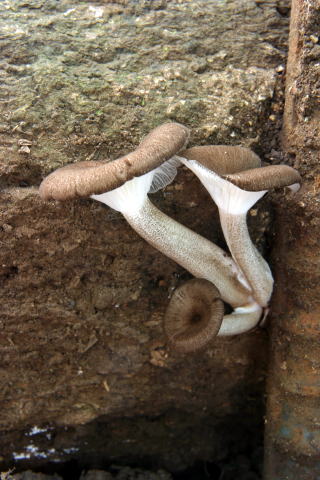 階段に使われた材木から生えていてジョウゴ型にカサの真ん中が窪んでいる。すぐ近くにかなり大きくなった1本もあった。ヒロヒダタケモドキに似ているのだが、カサの色が違いすぎる。