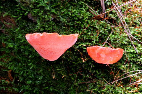 やや柔軟で水分の多い肉質。薄暗いスギ林の中ではかなり遠くから見つけることができる。幼菌の間はサジ型や逆三角型でいい被写体になってくれる。