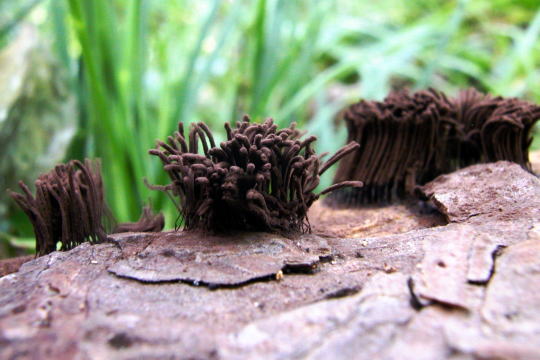 このところ毎回のようにいい状態の変形菌を見かける。小さいものが多いので今まであまり目に留まらなかったのだろう。本種は胞子が飛んでしまった後の網状のさやもとても美しい。(↓7/29撮影)