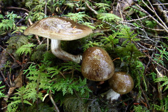 黒に近い褐色のカサで強い粘性があり、柄の根元はかぶら状に膨らむ。分かりやすい特徴だが種名が分からない。今日は広い範囲で見つけたから珍しい種類ではないはずだが・・・。