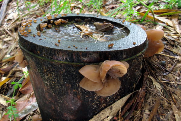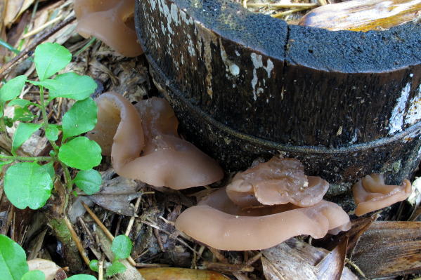 節のラインが1本なのでモウソウチクだと思うが、竹から生えるキクラゲは初めて見た。針葉樹からも生えるので、きっとナラタケのように強い菌なのだろう。下は別の切り株のもの↓。
