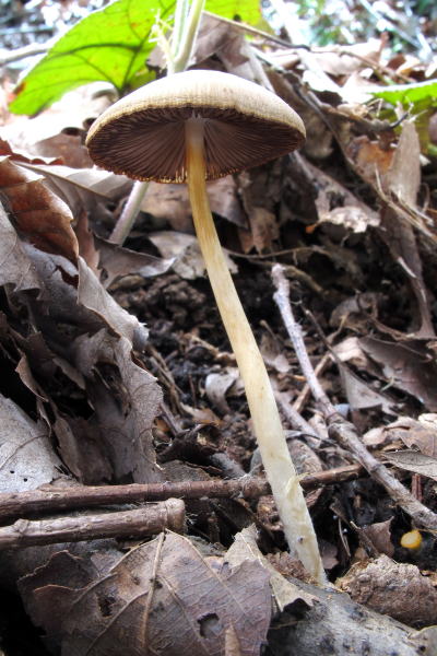 柄は上に行くほど細くなっている。ホウライタケ属も気になったので、ヒダに付いた胞子をルーペで見ると、黒っぽい褐色だった。やはり「デカいキコガサタケ」だろうか。