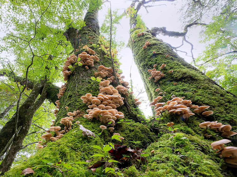 ナラ枯れで枯れた5人抱えくらいのミズナラ2本にナラタケが一斉に出ていた。材に活力があるので肉厚で大きく食菌としても最高だった。